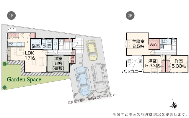 2F:洋室8.5帖、洋室5.33帖、洋室5.33帖